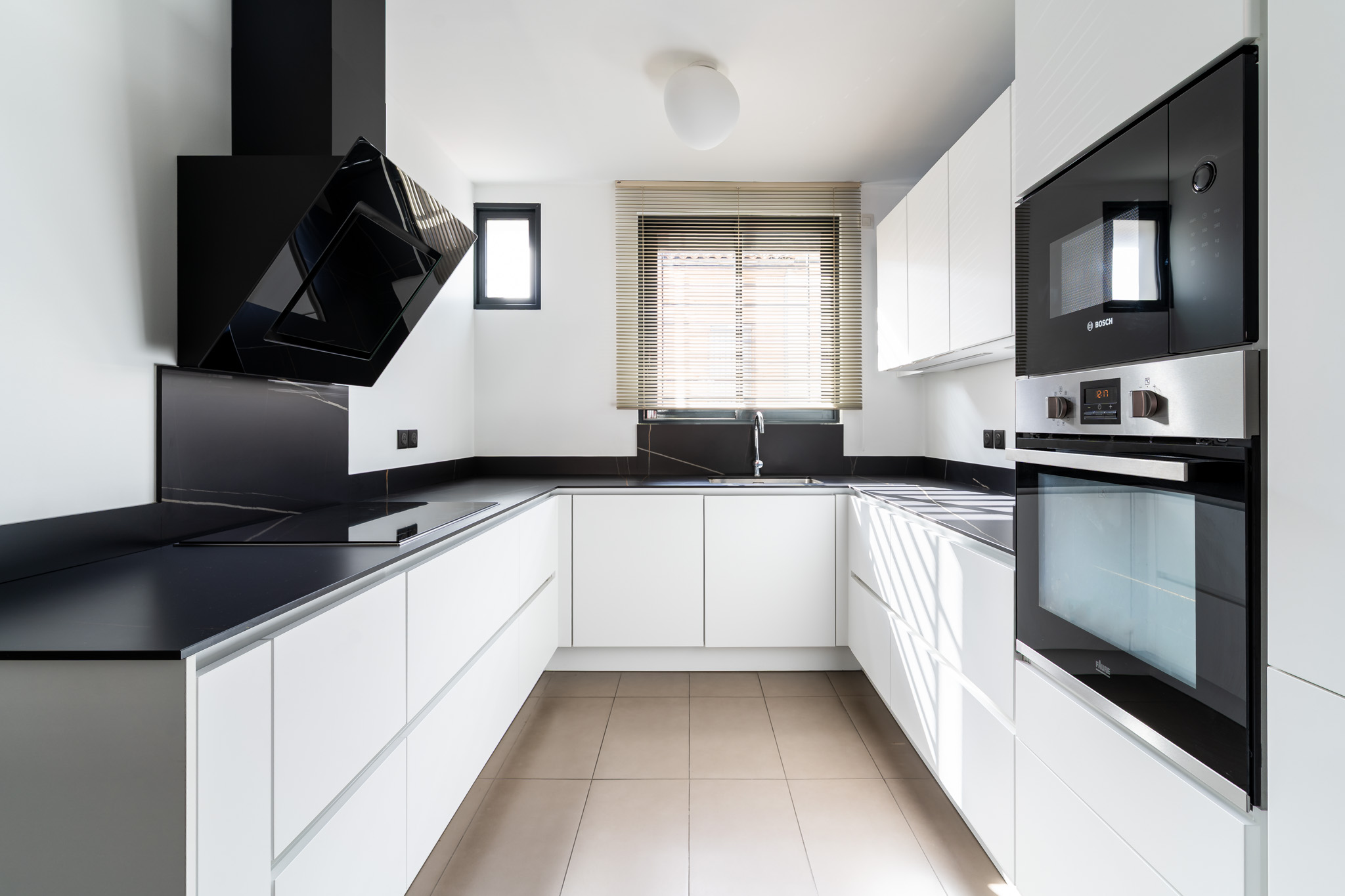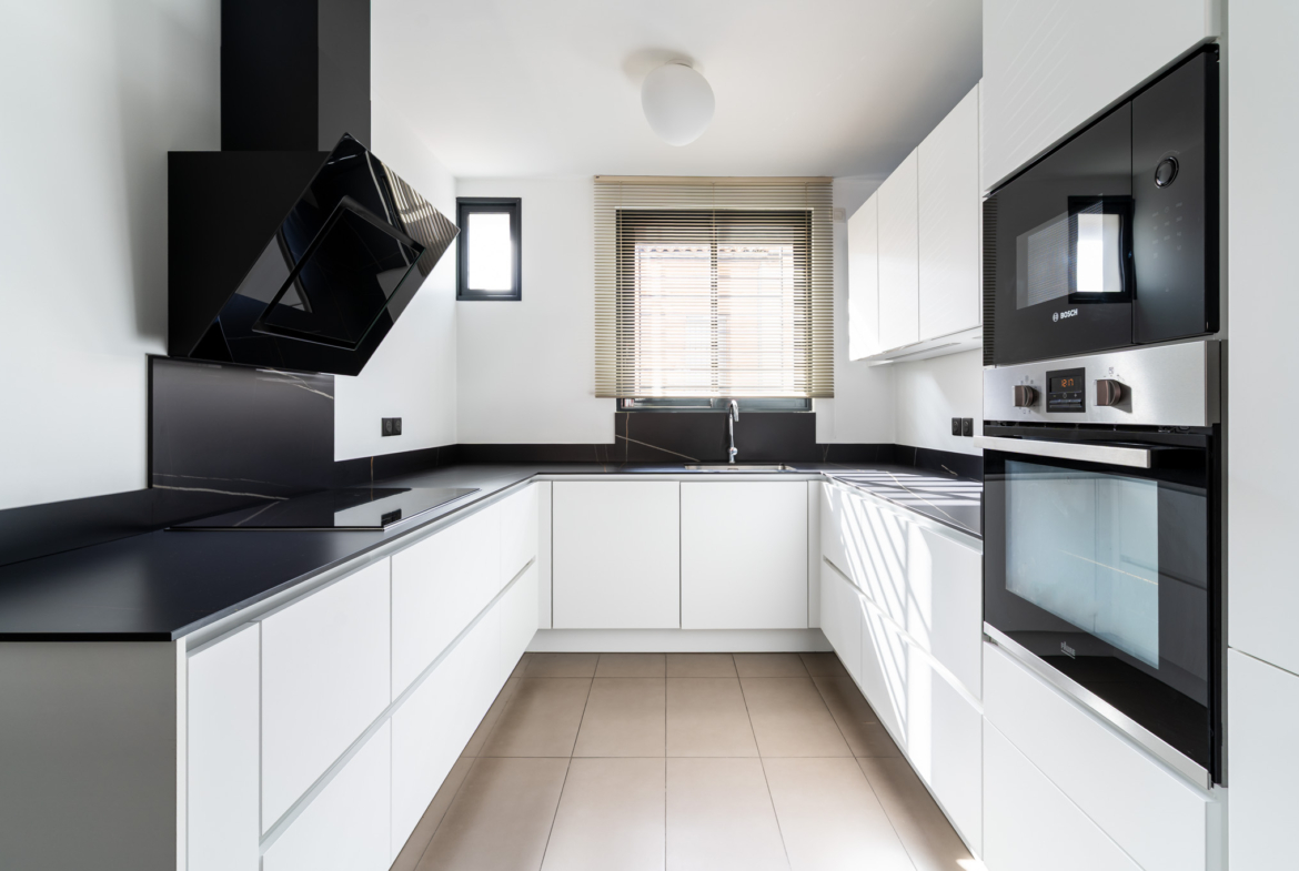 La cuisine, parfaitement intégrée, marie matériaux de qualité et lignes contemporaines.