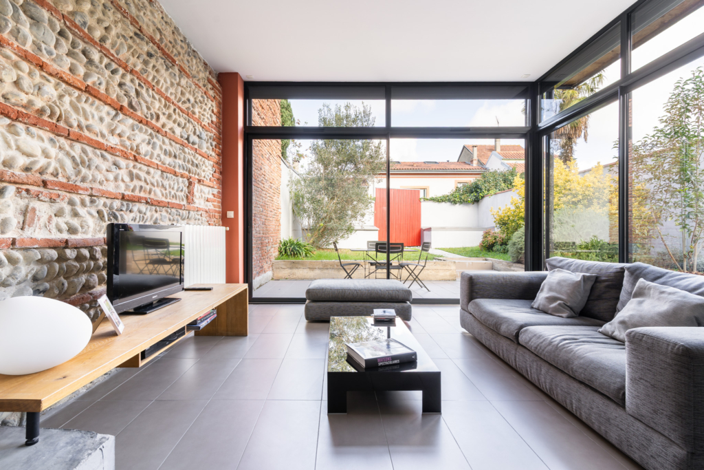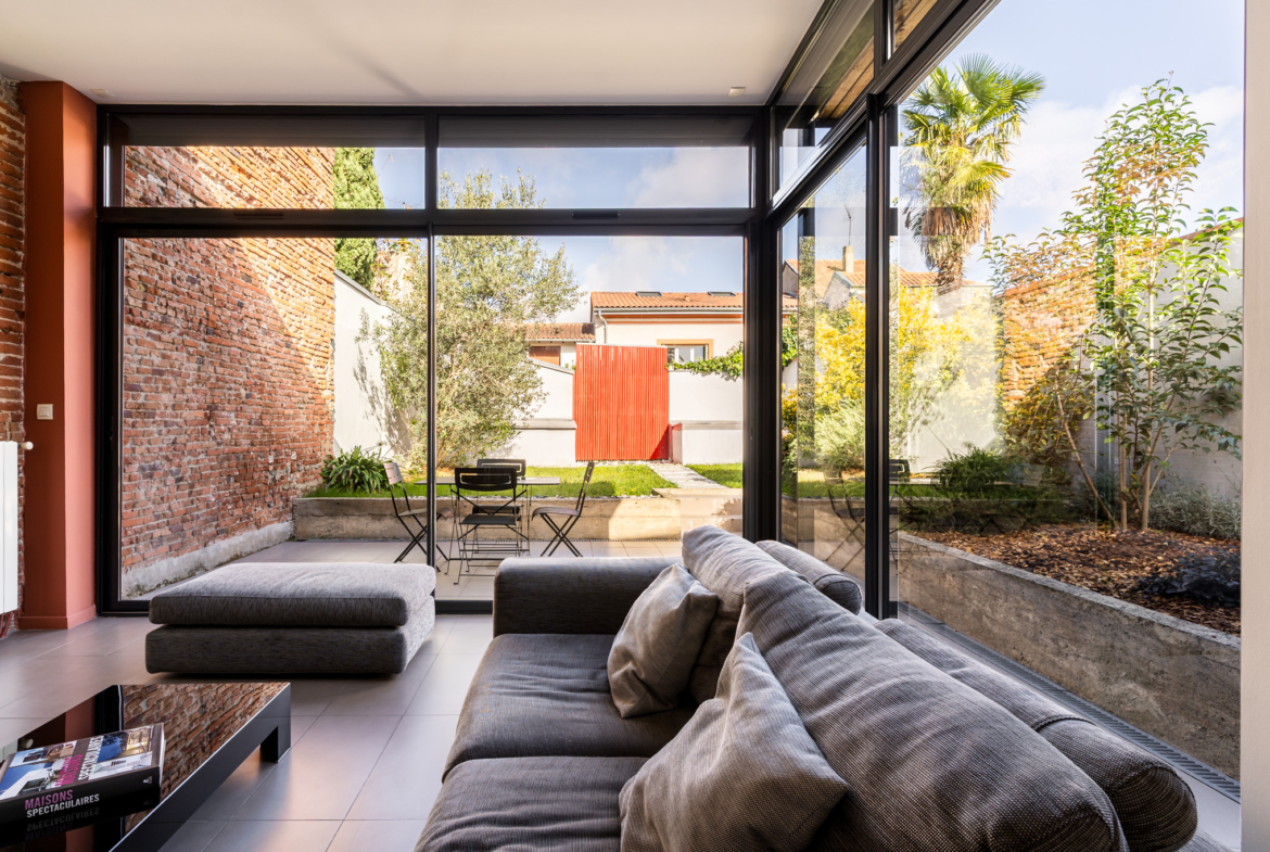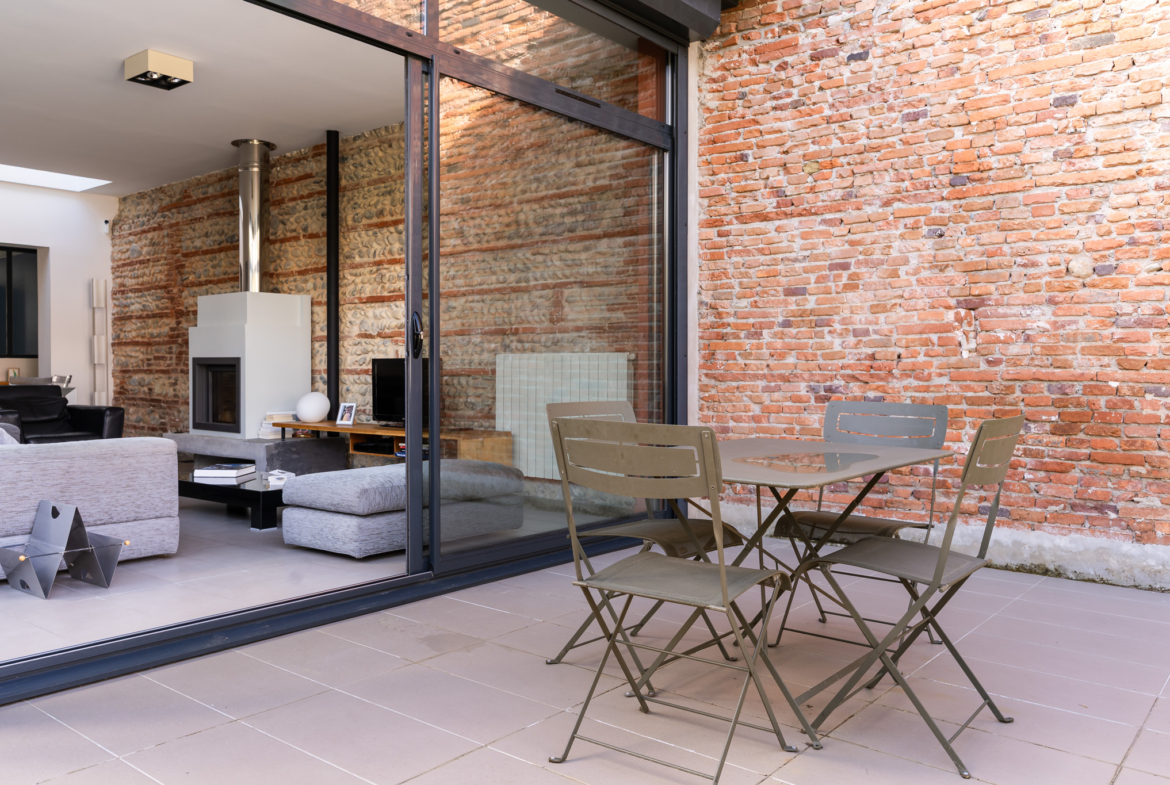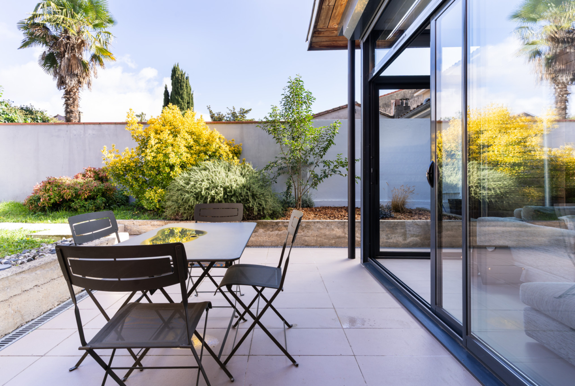 La pièce de vie, lumineuse et chaleureuse, s’ouvre sur un jardin-patio intime. Un véritable cocon extérieur, parfait pour vos repas d’été ou vos moments de détente.