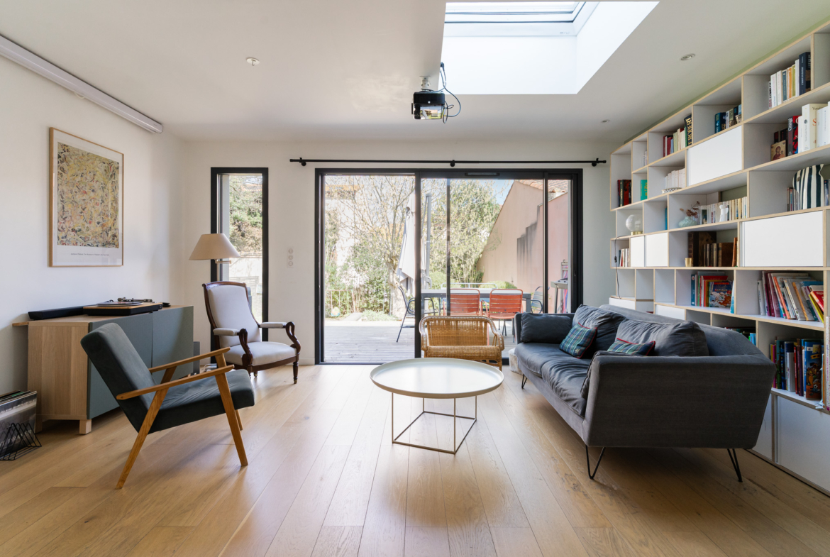 La pièce de vie, lumineuse et chaleureuse, s’ouvre sur un vaste jardin-terrasse.