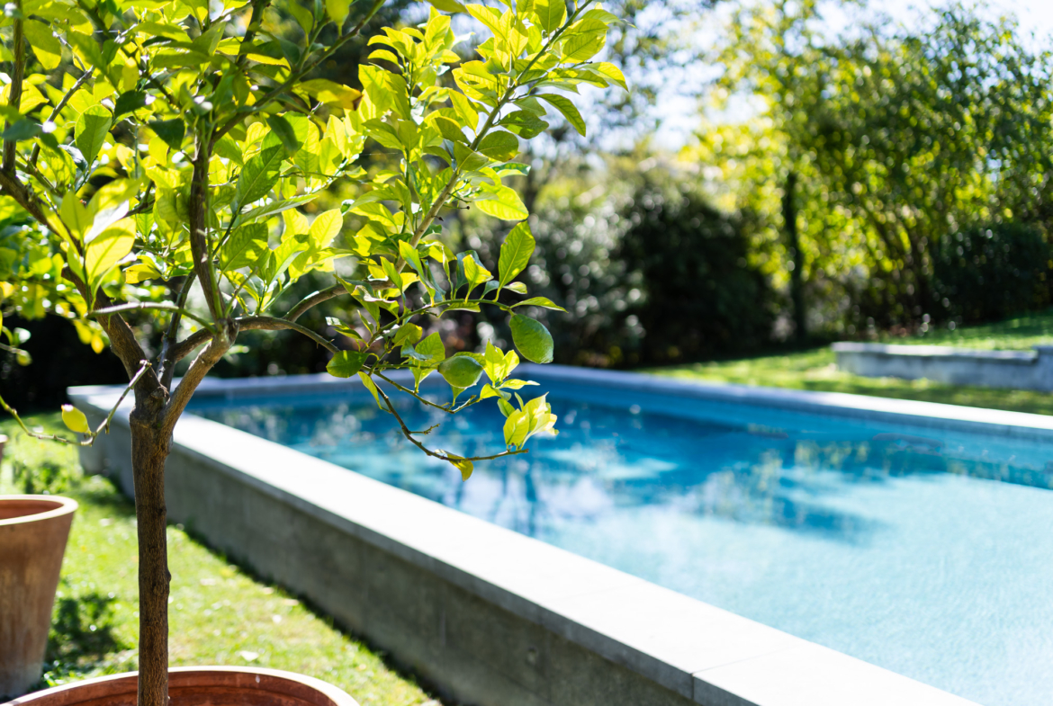 À l’extérieur, la piscine s’étire face aux coteaux, comme suspendue entre ciel et terre.